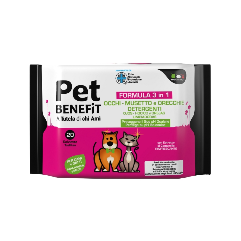 Pet Benefit Salviette Occhi e Musetto studiate per l’igiene quotidiana di occhi, musetto e orecchie di cani e gatti, sono ideali per rimuovere polvere, secrezioni ed impurità nel rispetto del pH iso-oculare e per non creare irritazioni né arrossamenti durante l’uso.